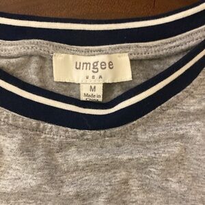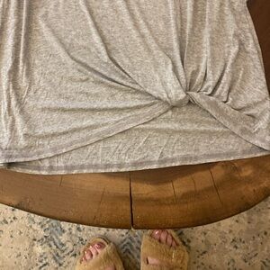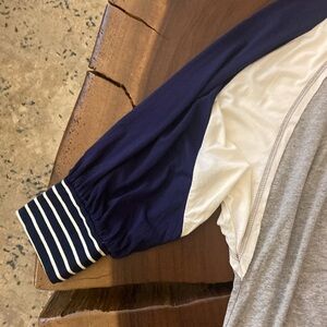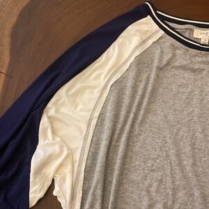 Stylish women's top featuring a gray body with blue and white sleeves. Perfect for casual outings. Super soft, twist detail on front of hem. 3/4 length sleeves, lightweight.