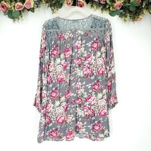 Umgee Gray and Pink Floral Long Sleeve Tunic Dress. Gray with a gorgeous pink floral pattern. Lace up V-neck front. Lace shoulder and back neck detailing. Two front pockets. Long sleeve with elasticized cuffs. Size Small. Great pre-loved condition, no visible flaws.