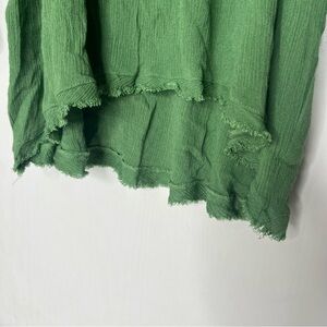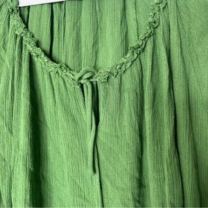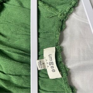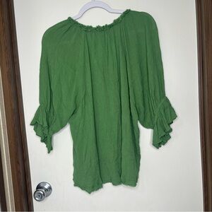 This vibrant green blouse by Umgee features elegant bell sleeves with a ruffled design, offering a relaxed and stylish look. The light and flowy fabric enhances its comfortable fit, making it a perfect choice for any casual occasion.