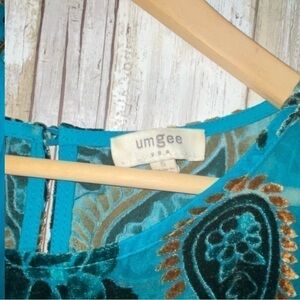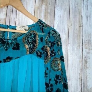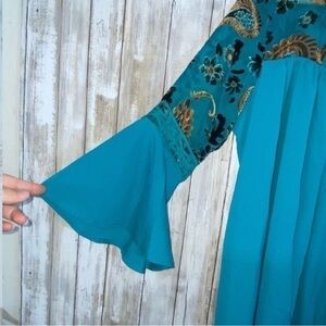 Elegant teal dress featuring a paisley pattern. Perfect for any occasion.