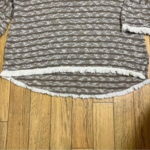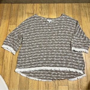 This is a Plus size UMGEE blouse in Latte color with a striped pattern and fringe accents on the hem. The style number is 2147. It is a stylish and trendy shirt for women in size 1XL.
