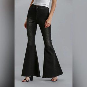 Umgee High Rise Fringe Hem Boho 70s Bell Bottom Stretch Denim Jeans Black New 7
