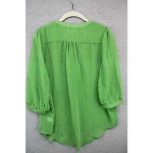 Umgee Kelly Green Sheer 3/4 Sleeve Top-Size Large. Item is in Good Condition but does have a string pulled on sleeve (see pics). The material is 100% Polyester. Laying flat measuring armpit to armpit it is 23'' and 27'' in length.