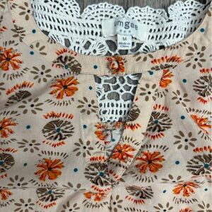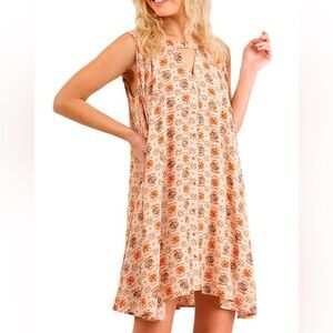 Sweet summer loose swing dress with button choker keyhole front and lace panel back. Covered round button down front. Sleeveless, unlined, lightweight. Printed pattern and soft. Runs big.