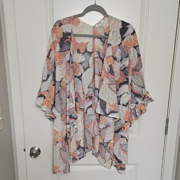 Chic floral kimono cardigan with a flowy design. Features a mix of colors for a stylish look. Ruffle sleeves Oversized In excellent condition