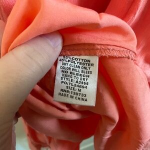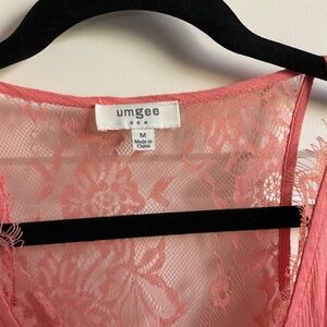 So pretty and feminine! Umgee lace detail gauzy dress. This is knee length. Very flowy. Pretty peachy pink color.