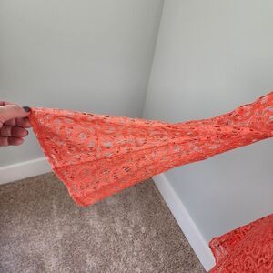 Umgee women's dress. Size small. Lace overlay. Lined. Sheer long bell sleeves. Scoop neck. Pullover. Orange. 55% cotton. 45% polyester. Like new. No tears or stains.