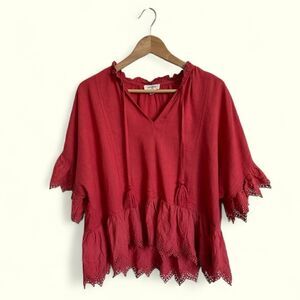 In like new condition! Umgee Linen Blend material, Baby doll top with lace crochet detail, Solid red brick color, Round Neckline with split V and ties, Short Sleeves.