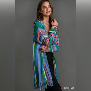 This Lazy Daze Cardigan Sweater features a vibrant multi-stripe design with charming fringe details on the bottom. Made with soft and lightweight acrylic material, it guarantees true-to-size fit for ultimate comfort. Upgrade your wardrobe with this stylish and versatile piece. The colors are incredible in person. Sweater is soft & stretchy
