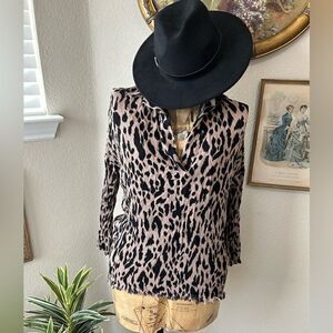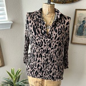 Umgee Leopard Tan Black Animal Print Long Sleeve V-Neck Tunic Blouse Raw Hem S