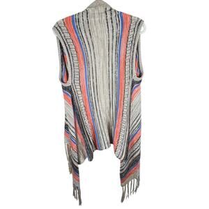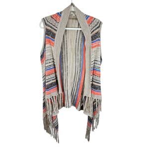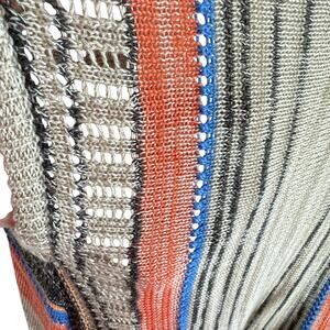 Excellent preowned condition. Lightweight breathable Striped open knit vest with fringe hems. Cotton/polyester material. Approx. measurements: Shoulder to hem 23-43", pit to pit 20". Size S/M.