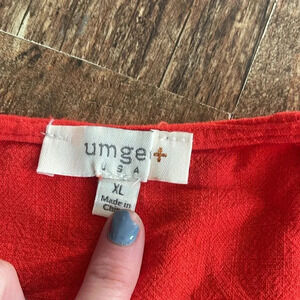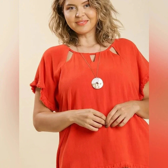 Umgee Linen Blend Cut Out Round Neckline Top with Frayed Fringe Hem