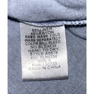 This is a women's Umgee linen blend top in size small, featuring a blue color with cap sleeves and a raw frayed hem. It has a round neck and a bohemian style, making it suitable for travel and casual wear. The top is lightweight and breathable, ideal for summer, fall, and spring seasons. Hand wash only. Made of linen blend and cotton fabric in a woven style, it offers a comfortable and regular fit.