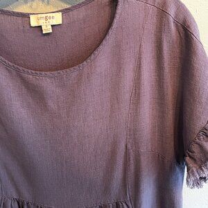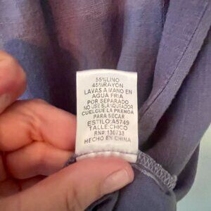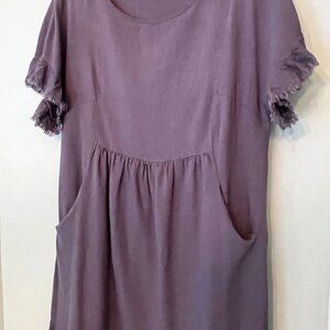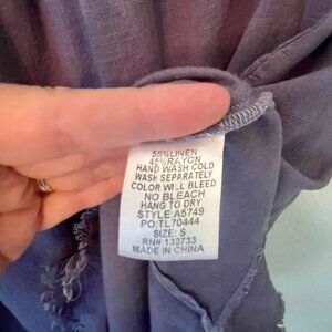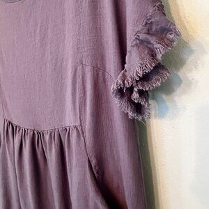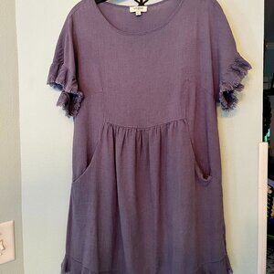 Umgee Casual Summer Dress with fringe in a french blue or periwinkle (more blue than purple as photos may show), in a breezy linen and rayon blend, size S. Worn once. Perfect for casual summer days or to throw on over bathing suit. Very cute. Measures 34" from shoulder to hem. I am 5'7", and it hits about 3" above my knee. Smoke-free home.