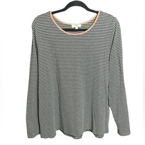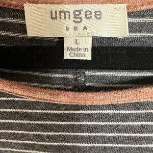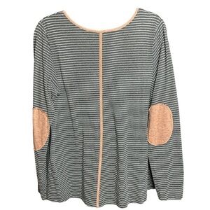 Umgee women’s size large. Long sleeve with brown elbow patch. White and gray stripe pattern.