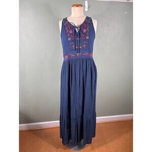 Umgee Women's Size Small Blue Embroidered Floral Tie Front Sleeveless Maxi Boho Cottagecore Dress