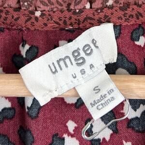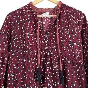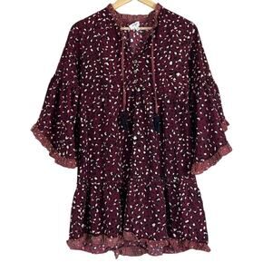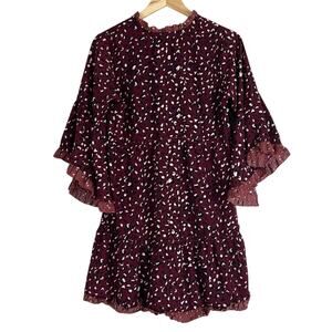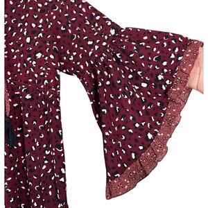 Umgee Mini Dress Womens S Burgundy Leopard Print Cottagecore Ruffle Bell Sleeve
