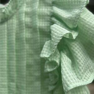 Adorable light green blouse with ruffled sleeves. 100% Cotton lining with Poly exterior.