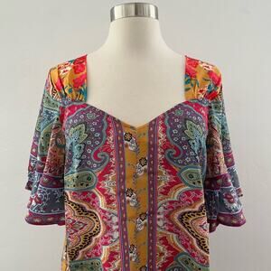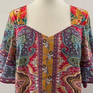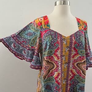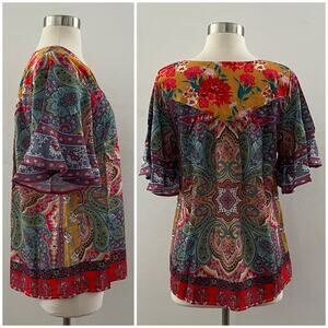 Umgee Mixed Floral Paisley Top Women's S Boho Ruffle Patchwork Vibrant Colorful
