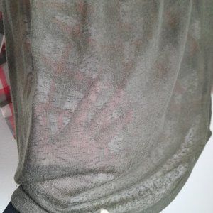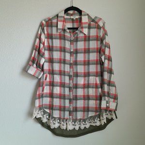 Umgee Mixed Media Plaid Button Up Convertible Sleeve Tunic Lace Trim Size S
