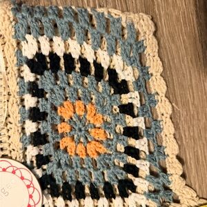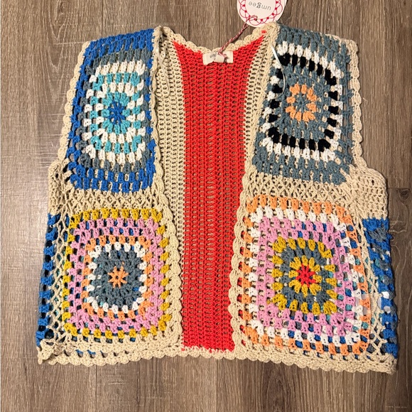 Chic crochet vest with vibrant patterns. Features red, blue, and cream tones.