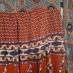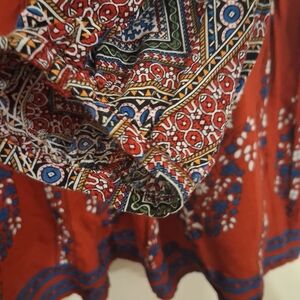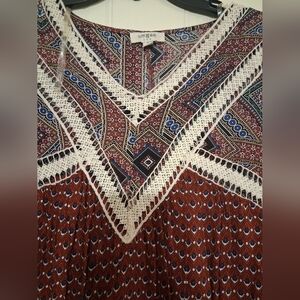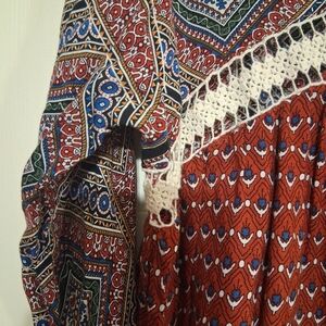Vibrant dress with geometric patterns. Features a crochet neckline. Ideal for a chic look. 100% cotton