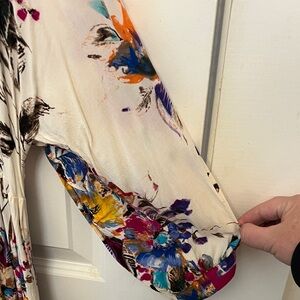 Vibrant top with geometric patterns. Features pink, blue, and cream hues. Ideal for casual wear. Long design - great for wearing over leggings. Size medium.