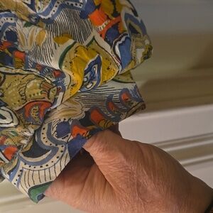 Chic top with a blend of floral and abstract patterns. Features a mix of blue, yellow, and red hues.