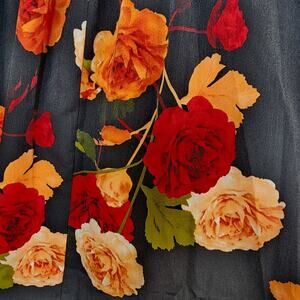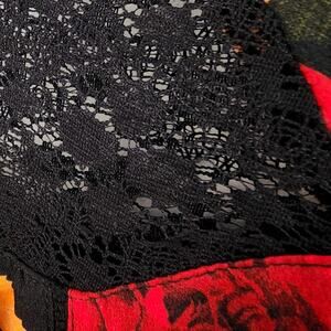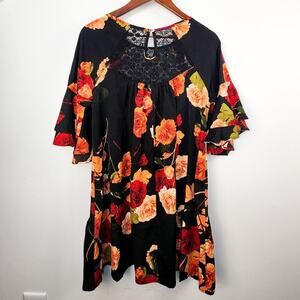- Description: Red and yellow dramatic floral peasant style mini dress; tiered skirt and tiered 3/4 length bell sleeves; lace detail at front collar; keyhole cutout at back with button closure; pullover design