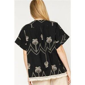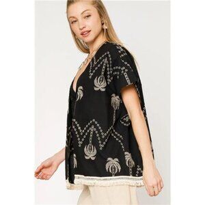 *This stunning kimono-style cover up features intricate white embroidered palm trees and geometric diamond patterns on a classic black base. Made from lightweight, breathable fabric perfect for beach days or summer evenings. The open-front design with short sleeves offers easy layering over swimwear or casual outfits. Finished with delicate fringe trim along the hem for added bohemian flair. The relaxed, oversized fit provides comfortable coverage while maintaining a stylish silhouette.