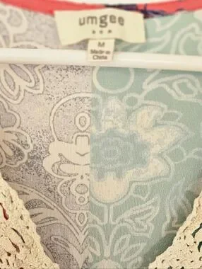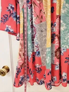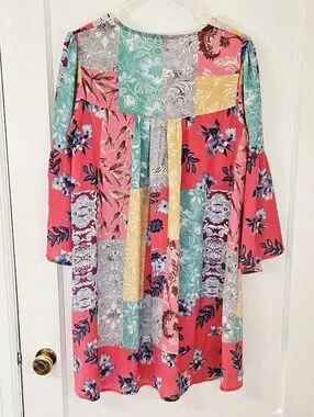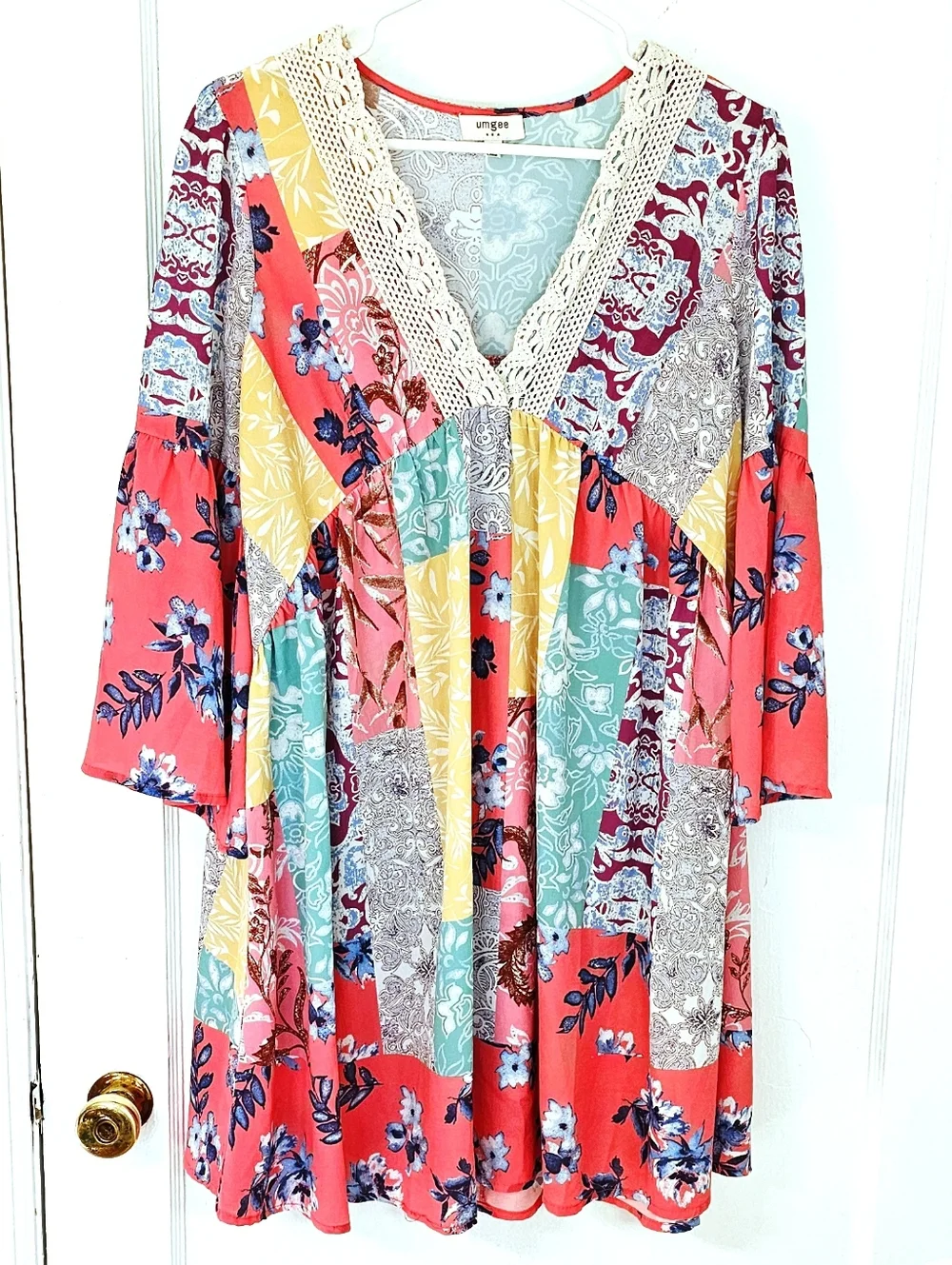 Super cute Umgee v-neck dress / tunic top featuring a patchwork floral print in bright beautiful colors. Relaxed, flowing design with 3/4 bell sleeves & boho cream crochet trim detailing along the neckline. The tag says medium size but it fits more like a large size. Great condition, no flaws!