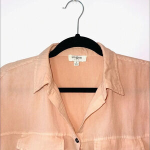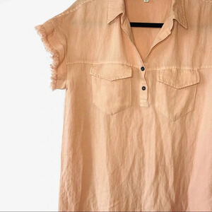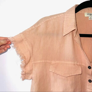 Umgee peach/blush utility mini dress. In excellent condition! Split neckline. Two button details. Collared. Flap closure front pockets. Short sleeves. Round bottom hem. Frayed hems on the sleeves & bottom. Utility shirt style. Mini silhouette. Unlined. Peachy pink color. Size small.