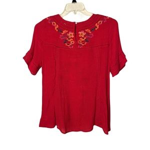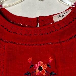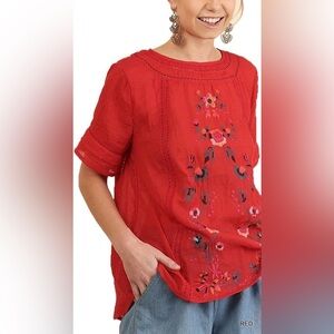 Umgee | Red Embroidered Floral Short Sleeve Peasant Blouse, Large