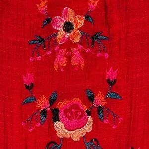• Red with multicolored floral embroidery