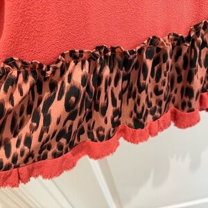 Stylish red top with leopard print ruffle trim. Perfect for a bold look.