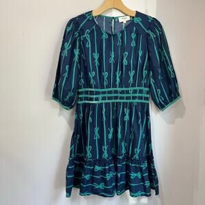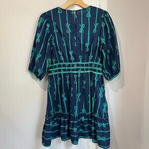 Umgee Ribbon Print Puff Sleeve Velvet Trim Boho Mini Dress Casual Holiday L