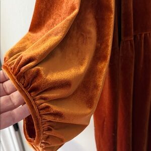 Chic velvet button-down in rich rust. Ideal for a fashionable look.