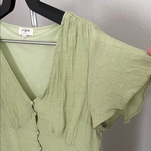 Elegant light green mini dress with button-down front and tie back. Flowy short cap sleeves. Perfect for casual outings.
