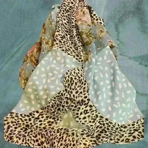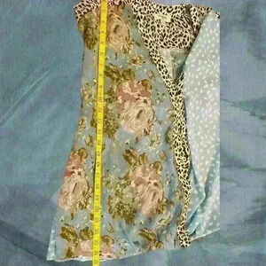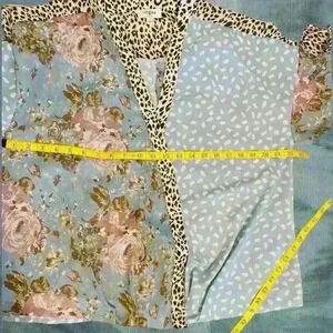 Great casual office wear. Several fabric designs used throughout the garment; animal print, floral print and geometric print. Never worn but laundered. No snags, stains or rips. Well cared for. Size large very loose fitting. Daytime to nighttime. Casual to dressy. Excellent preowned condition
