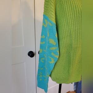 Two-tone green and blue sweater is perfect for any casual outing. Enjoy the comfort and warmth it provides while making a fashion statement. Animal Print detail on sleeves. Comes from a smoke and pet free home. New with tag. Excellent quality by Umgee.