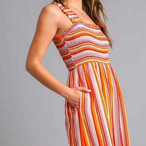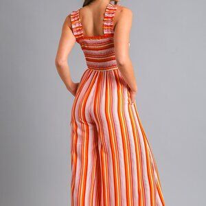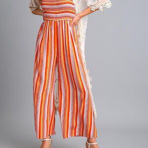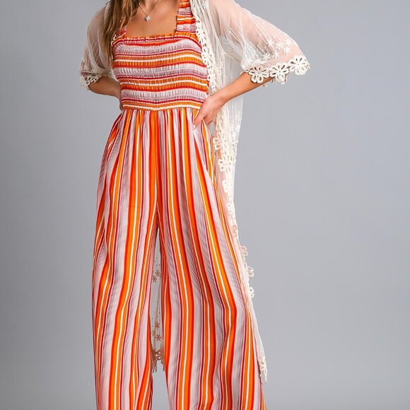 Vibrant Umgee jumpsuit with red, orange, and white stripes. Paired with a sheer lace kimono. Perfect for a stylish look.