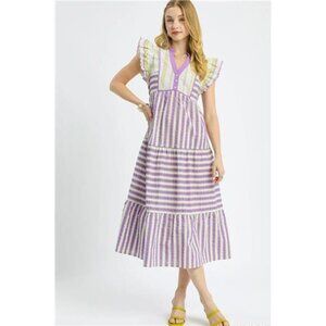 *This charming boho-inspired midi dress features a delightful purple and white striped pattern that exudes feminine elegance. The dress showcases a flattering V-neckline and adorable ruffle cap sleeves that add romantic charm. The empire waistline creates a flattering silhouette while the tiered midi-length skirt provides graceful movement. Crafted from lightweight, breathable fabric perfect for warm weather styling. The bohemian design elements including the striped pattern and tiered construction make this dress ideal for casual outings, beach vacations, or summer gatherings. The versatile purple colorway pairs beautifully with sandals or wedges for effortless day-to-night styling.