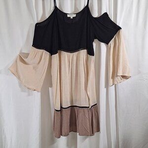 Umgee Sz Large Colorblock Cold Shoulder Dress Knee Length Black, Brown, Cream
