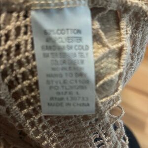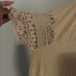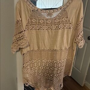 Elegant tan blouse with intricate lace details. Perfect for casual or dressy occasions.