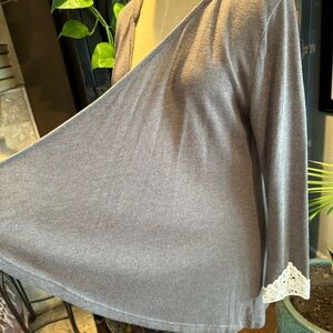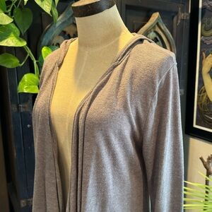 Umgee Taupe Brown asymmetric open front hooded cardigan with crochet lace cuffs