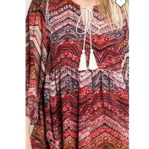 Umgee Tie Front Red Mix Aztec Print Boho Babydoll Dress