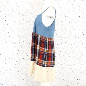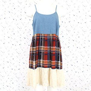 Umgee Tiered Dress Denim Plaid Lace Dark Denim