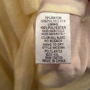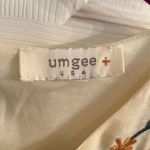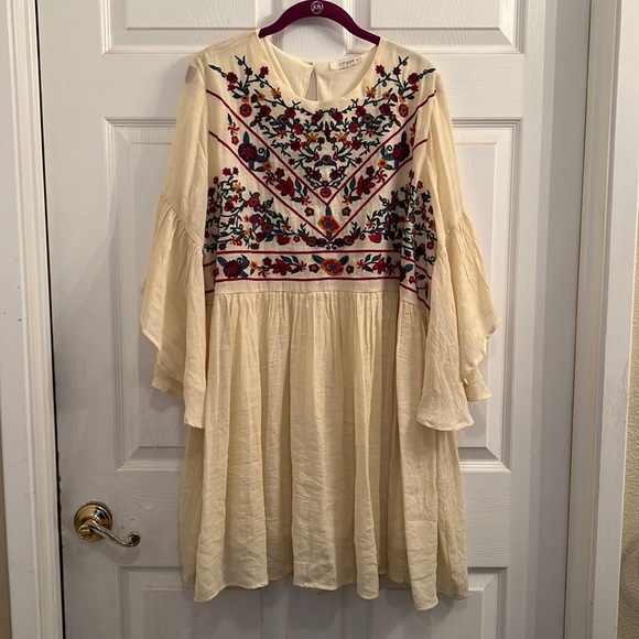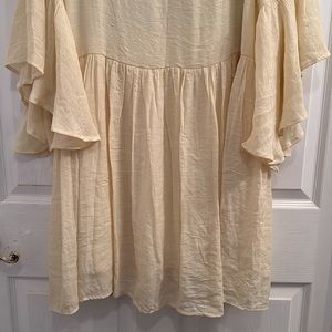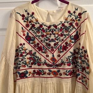 Umgee Top in Size 1X. Cream color with Floral embroidery. Bell style hi-lo sleeves.