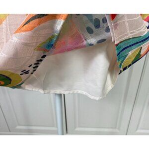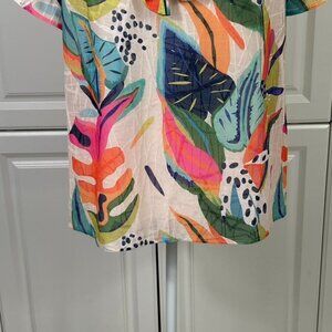 Umgee Top Size M Abstract Multicolor Print Boho Art to Wear Short Ruffle Sleeve Bold Botanical Tropical Artsy