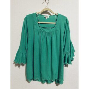 Umgee Top Womens Medium Bright Green Ruffle Bell Sleeve Linen Blend Fringe Hem